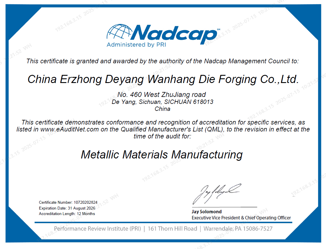 近日,萬航模鍛順利通過國際權(quán)威認(rèn)證機(jī)構(gòu)NADCAP的嚴(yán)格審核,成功獲得鍛造特種工藝認(rèn)證證書,成為國內(nèi)少數(shù)具備NADCAP鍛造資質(zhì)的企業(yè)。 獲得NADCAP鍛造認(rèn)證,是萬航模鍛國際化戰(zhàn)略的關(guān)鍵里程碑。在歷時14個月的嚴(yán)格審核中,評估團(tuán)隊深入考察了萬航模鍛在質(zhì)量管理、工藝流程、設(shè)備控制及人你好!新員工2025-08-20