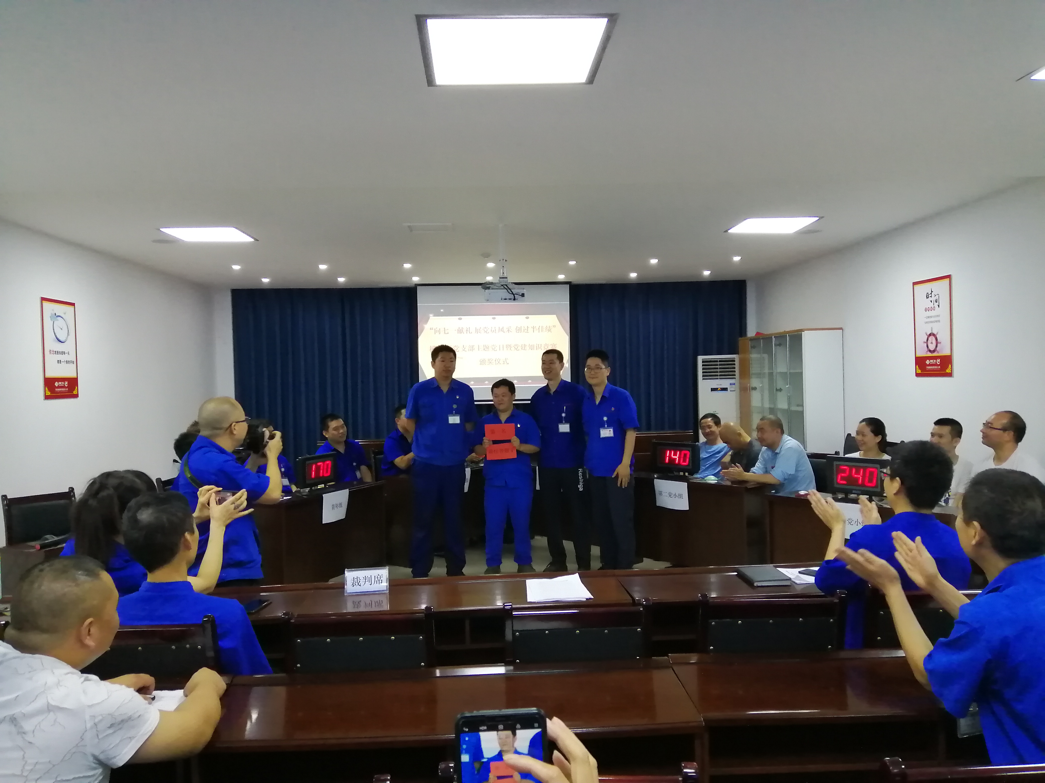 20日競(jìng)賽現(xiàn)場(chǎng),正式競(jìng)賽前隊(duì)員們一個(gè)個(gè)胸有成竹、摩拳擦掌、躍躍欲試。競(jìng)賽中隊(duì)員們配合默契、沉著應(yīng)答,隊(duì)員們精彩的作答贏得了一波波熱烈的掌聲。整個(gè)競(jìng)賽現(xiàn)場(chǎng)秩序井然、氣氛熱烈。經(jīng)過激烈角逐,模鍛廠黨支部第三黨小組代表隊(duì)以答題穩(wěn)、搶答快、正確率高榮獲總分最高第一名,第三黨小組代表隊(duì)成員劉強(qiáng)也以十五題百分之百正確率獲得最佳答題手榮譽(yù)稱號(hào)。